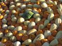 The pumpkin festival is taking place in our park. Pumpkins sit in flower pots, on wooden palettes, in trays, and on the grass.