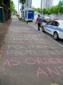 Having been moved on from City Square and the Treasury Gardens, the protesters have settled in Flagstaff Gardens. As part of their protest, chalk graffiti has appeared on the surrounding pavements and walls. I do not feel it is helping their cause.